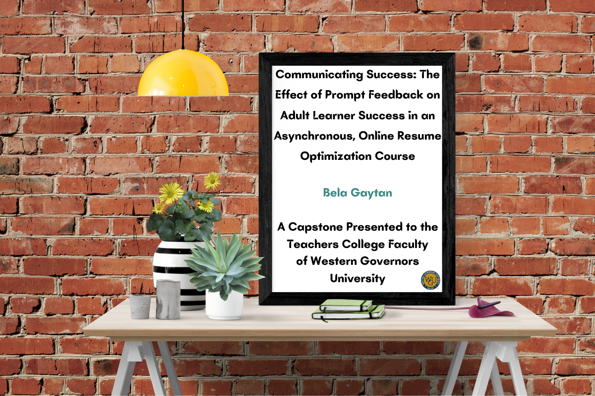The topic of this research centers on prompt feedback’s effect on adult student success in online coursework. The question that inspired this study was, “What is the effect of prompt feedback on adult learner success in an asynchronous, online resume optimization course, as measured by self-assessment Likert-scale questionnaires”? Ten research participants were chosen, all of whom are independent adults who are, or were previously, online students. The eight-hour course was taken on BrightBel.com, a website owned by the researcher, who was also the instructor in this action research study. Students were given prompt, effective, and personalized feedback throughout the course. Data was collected using three identical questionnaires containing close-ended and Likert-style questions following each of the course’s three modules. Average increases in success scores upon course completion were 75%, a significant increase. This demonstrates that the use of prompt feedback is highly effective and positively influences adult student success in online courses.