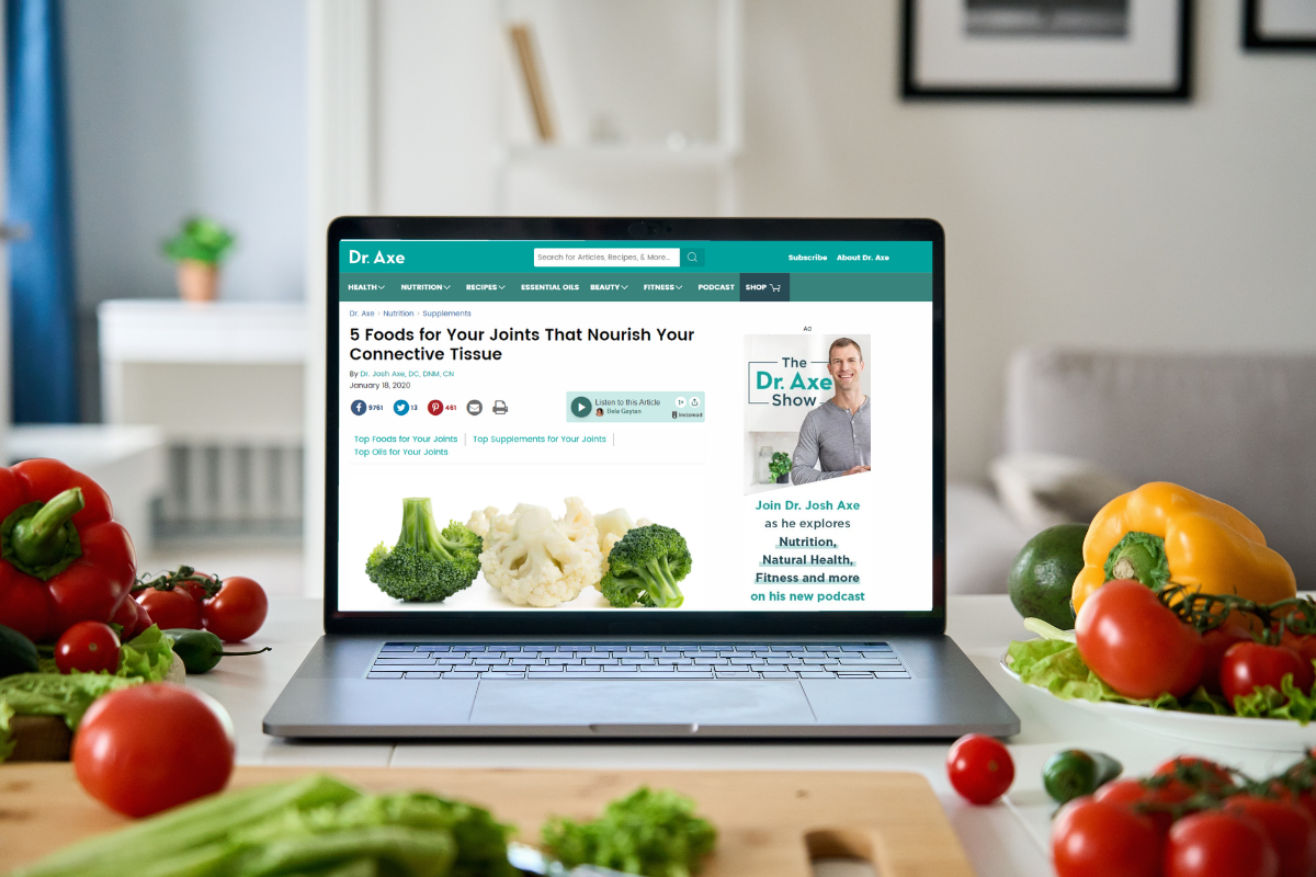 A laptop sits on a white tile countertop. There is a cutting board in front of the keyboard and fruits and veggies surrounding it. On the screen is an article Bela narrated on Dr. Josh Axe’s website: “5 Foods for Your Joints That Nourish Your Connective Tissue”.