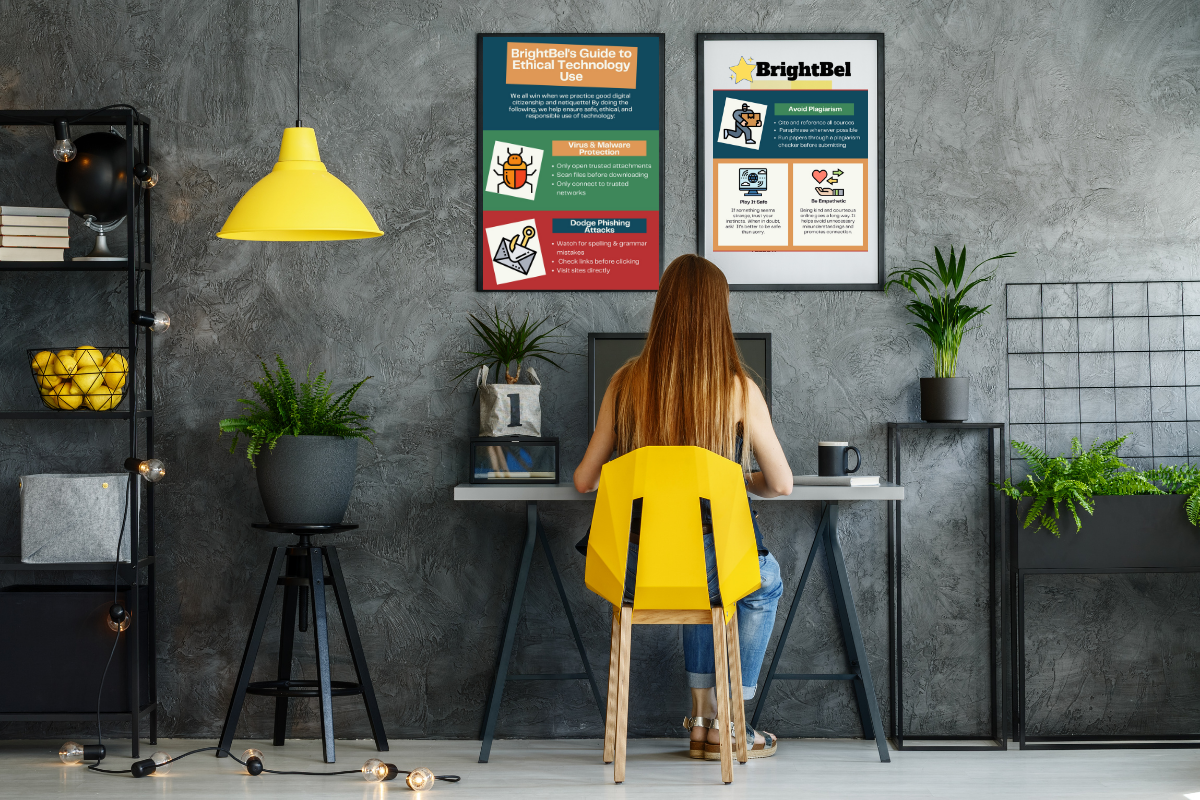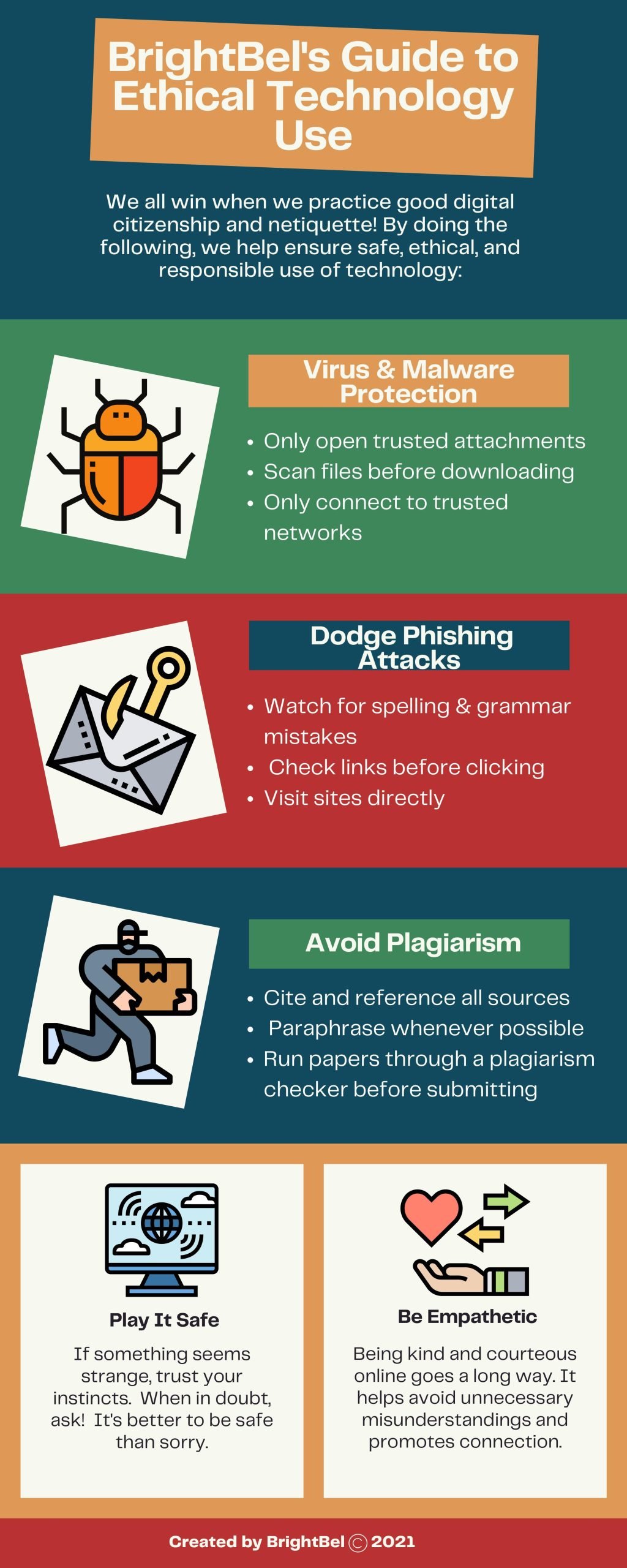 I created the infographic in Canva. I'm not a fan of infographics, for the most part, as they're often times too busy and contribute to excessive cognitive load. To balance the visuals and amount of content, I chose to highlight tips for the ethical use of technology. I created the infographic by "BrightBel", the brand for the course taught as part of my capstone.