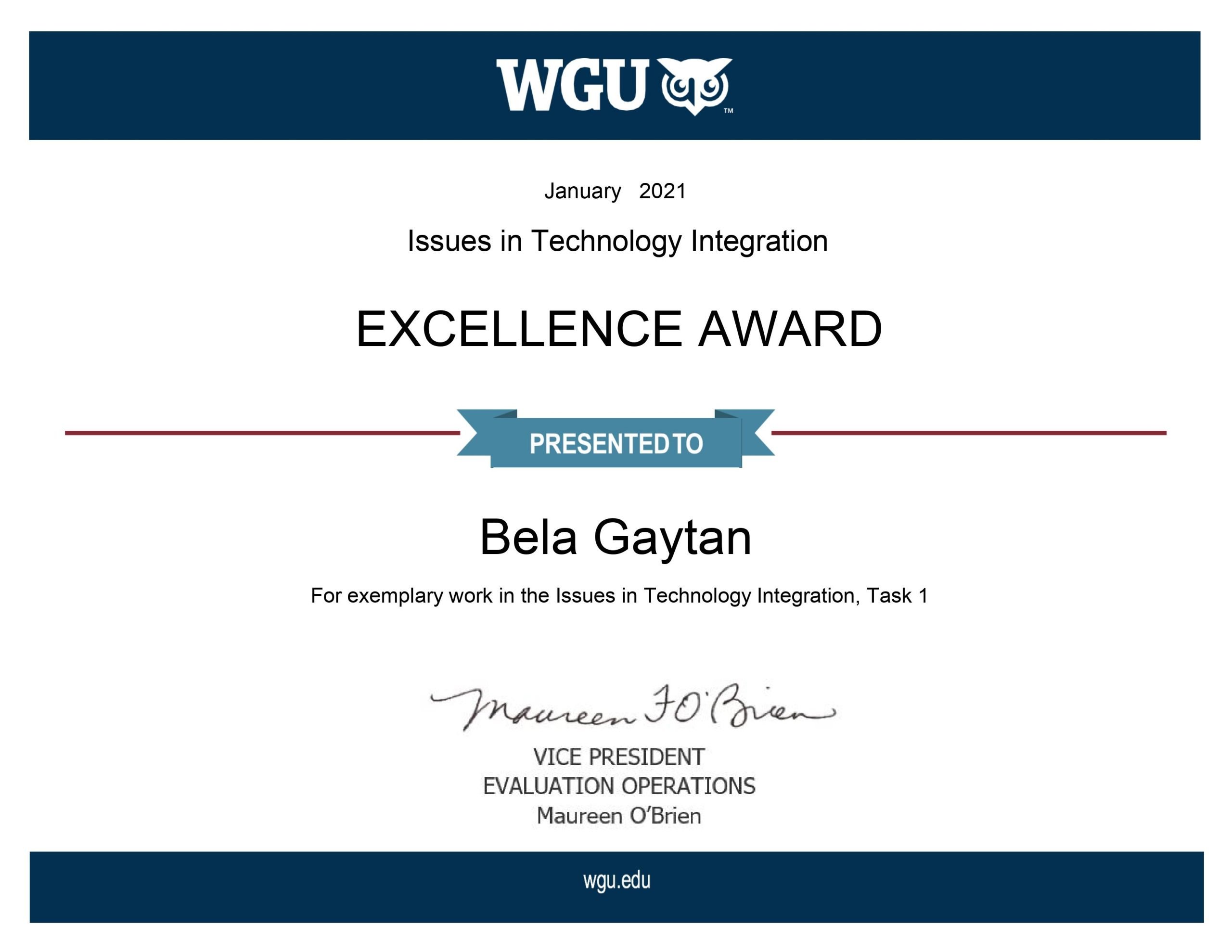 I received an award of excellence in recognition of my work submitted. According to WGU: “”